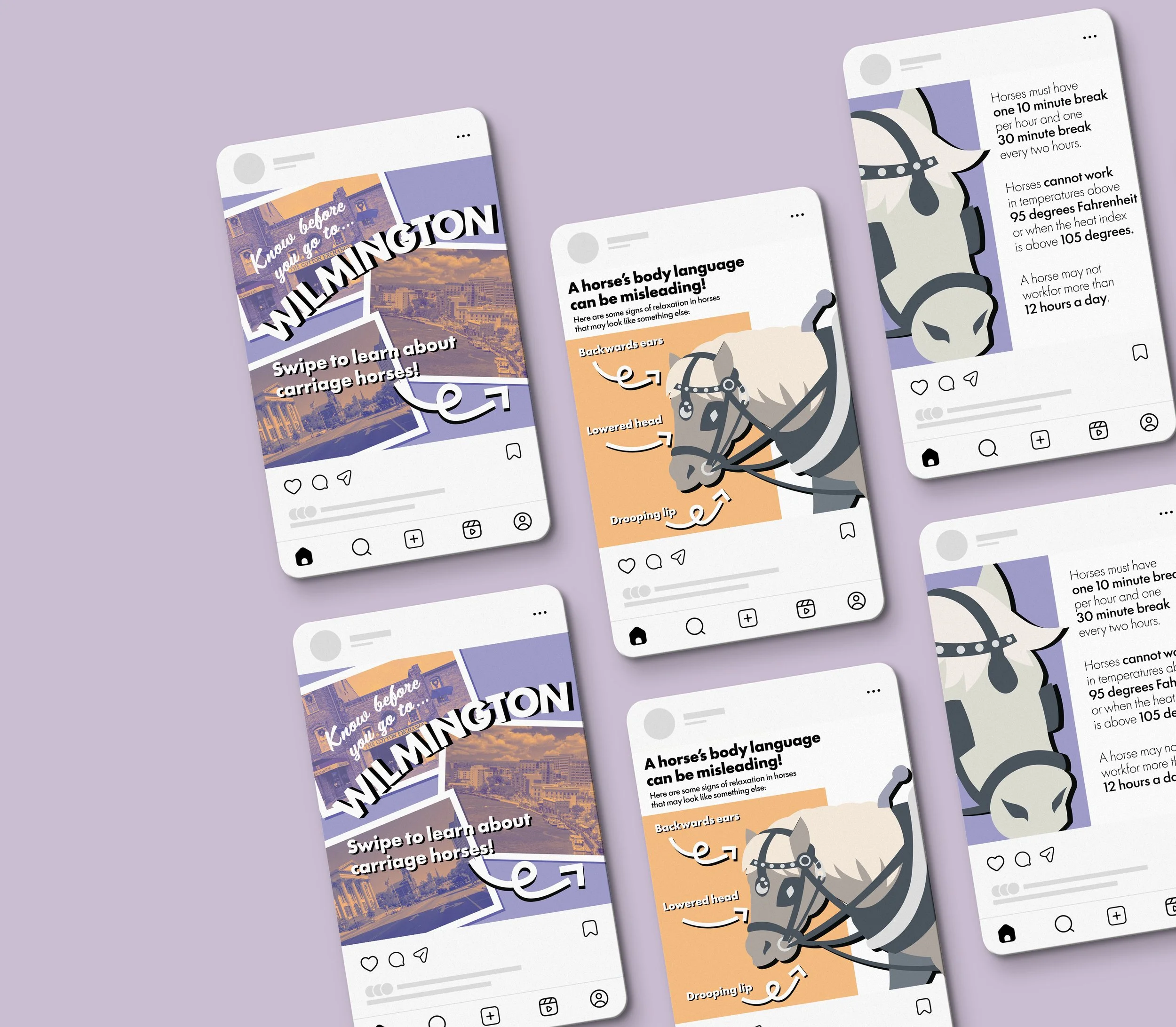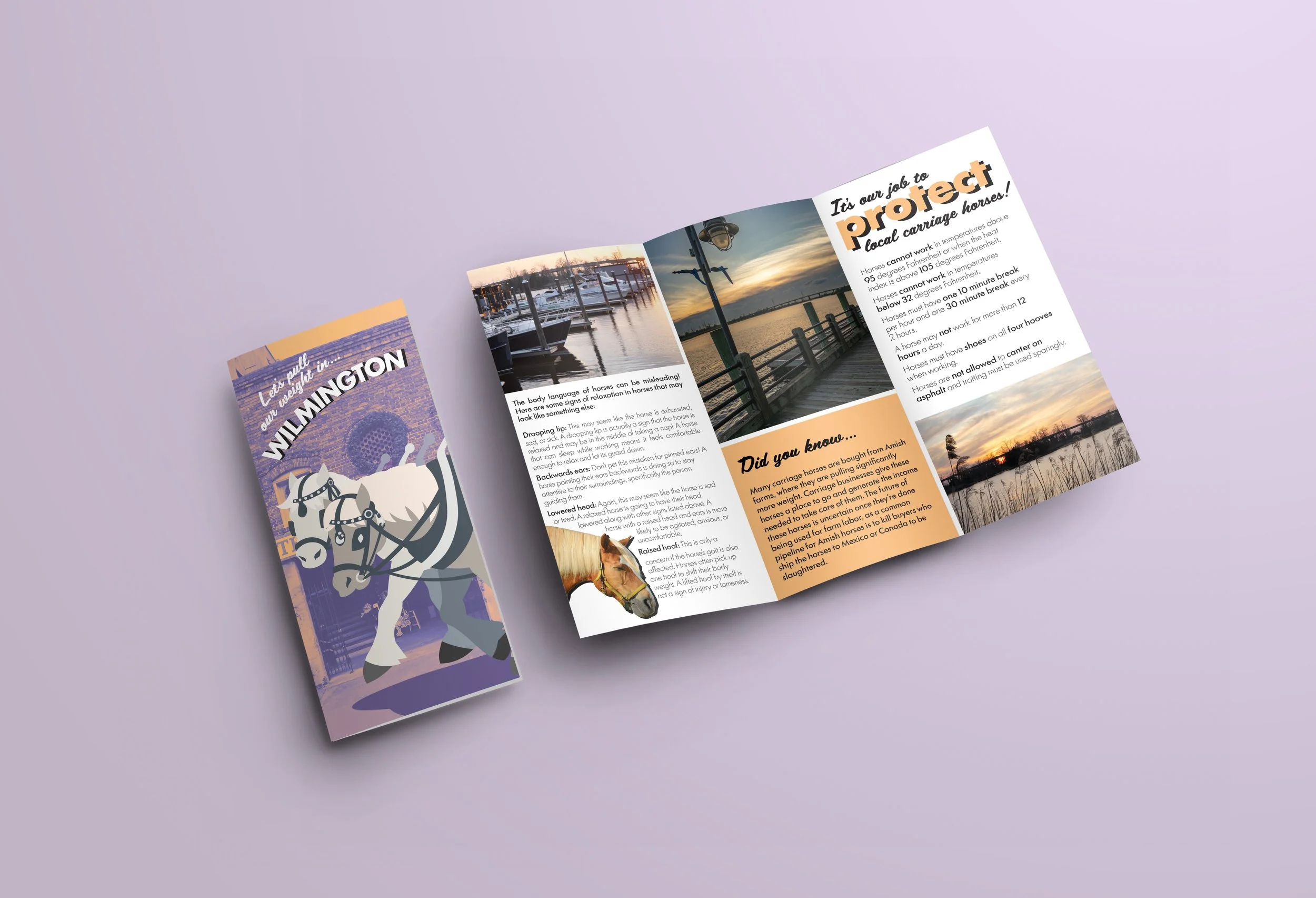 This project aims to educate tourists on the horse carriage industry and encourage responsible horse care and patronage. I developed this project using insights from a carriage business owner in New Orleans, equestrians, and individuals who have no prior knowledge on horse care or behavior. This really helped me develop visuals that spoke to tourists while staying true to the information presented inside. My design choices were meant to stay lighthearted, and I took inspiration from travel postcards to encourage their use as souvenirs.